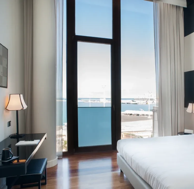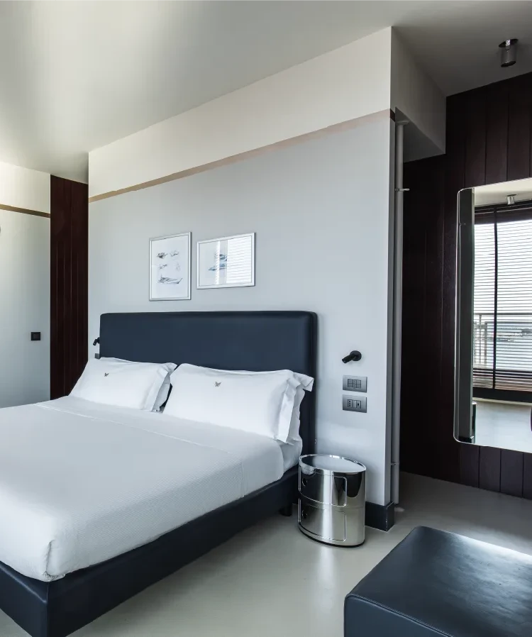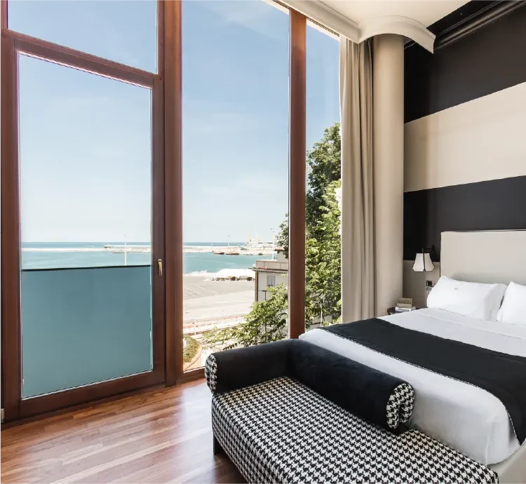 Ci inchiniamo al mare e al porto che sta proprio davanti a noi. Ne riflettiamo i colori. Ci immergiamo nelle nuances del ferro, che ad Ancona si declinano come tradizione e lusso innovativo. Con i cantieri navali, gli yacht e i vari delle navi che si scorgono dalle nostre vetrate. Il mare entra nella nostra lounge, così come i raggi del sole che, seguendo la stessa forma degli archi, compiono ogni giorno il loro cammino.